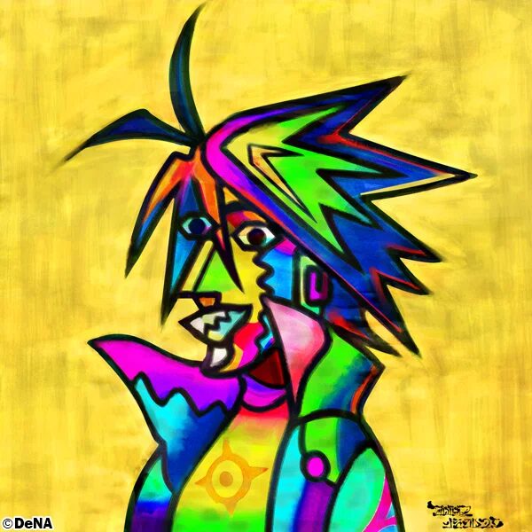 ま、強いて言うなら頭のオレンジ色はアイツの激情を…目の下の波線と右側の青は悩める感情の一部を表現してみたってトコかな。